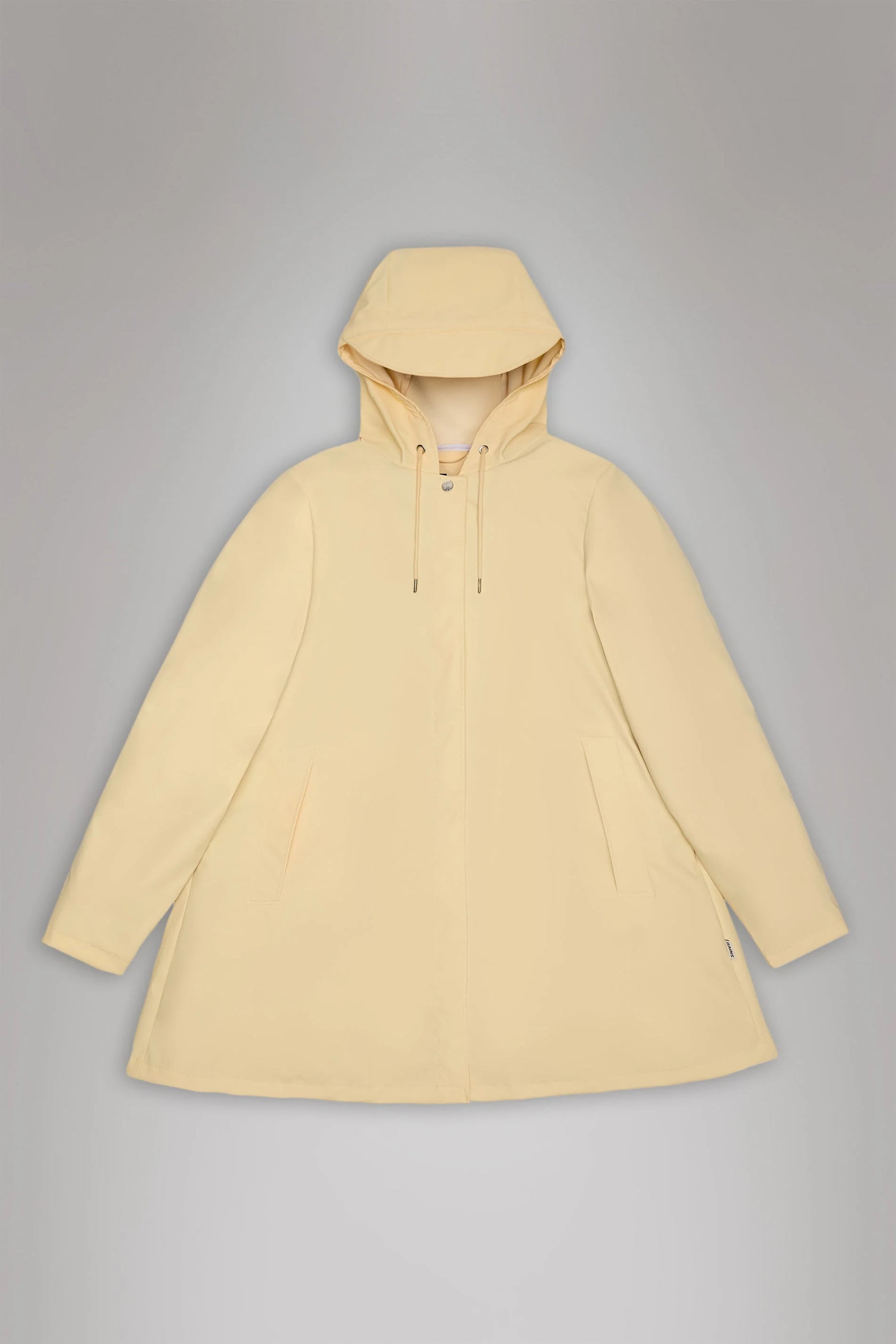 The Rains A-Line Jacket is a raincoat with a flattering A-shaped silhouette and elegant drape. Made from Rains’ signature waterproof PU fabric, it features a drawstring hood, hidden snap closures, and underarm ventilation. Lightweight and breathable, it's a refined yet functional layer to tackle those wet and windy days.