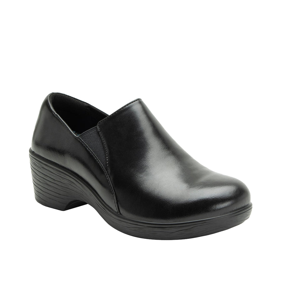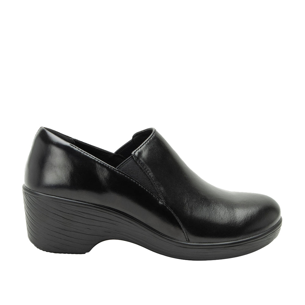 Dress up any look in this leather shootie detailed for comfort with elastic side goring and a padded collar. Taking comfort to the max is a lightweight slip-resistant wood-look wedge and removable microsuede lined footbed made of polyurethane, cork and memory foam. Featured in a Noir colorway on a leather upper.